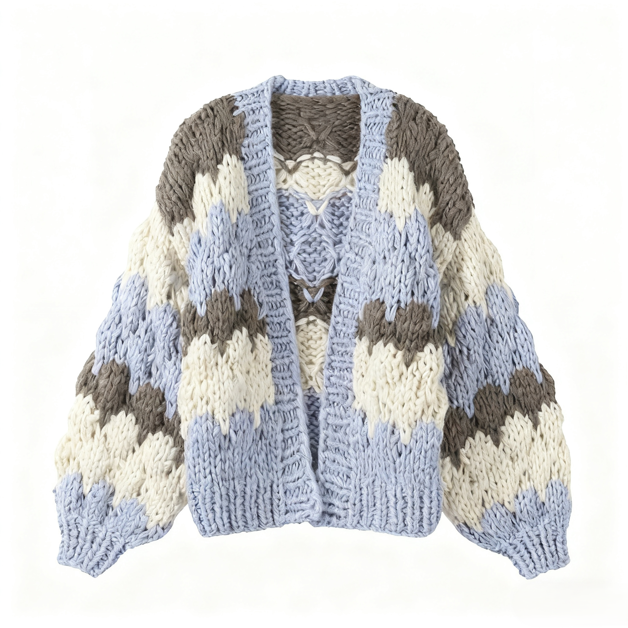 A Purely Hand-Knit Cardigan – Cool-Toned Yet Never Dull, Evoking the Bliss of Savoring Ice Cream Freely in Autumn Breeze. Timeless Elegance.
